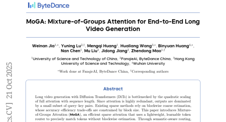 研究团队发现了一个重要现象:在视频生成过程中,大部分注意力其实都是冗余的,就像在一场聚会中,虽然房间里有很多人在说话,但你只需要专注听身边几个朋友的对话就能理解整个交流的核心内容。基于这个观察,他们提出了"混合群组注意力"(MoGA)机制,这种方法就像给视频中的内容分组讨论,让相关的内容聚集在一起进行"深入交流",而不是让所有内容都彼此"寒暄"。