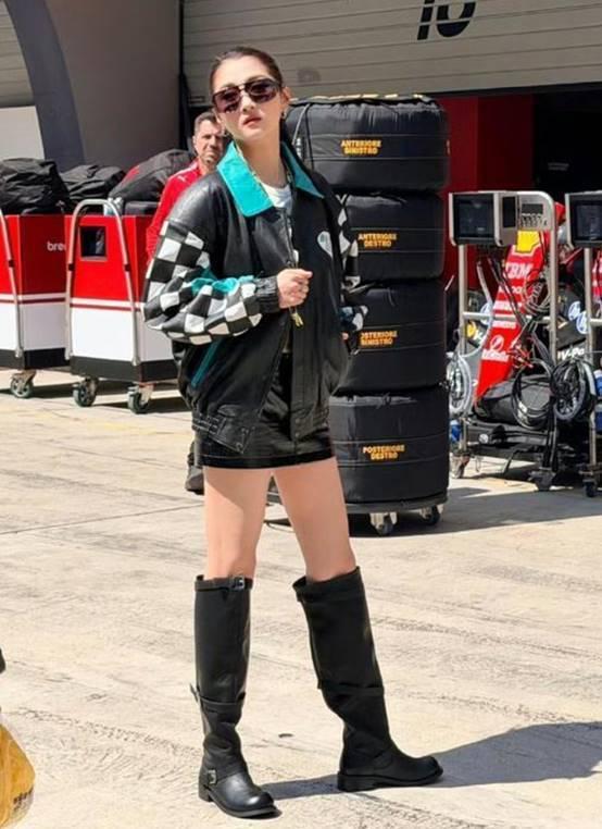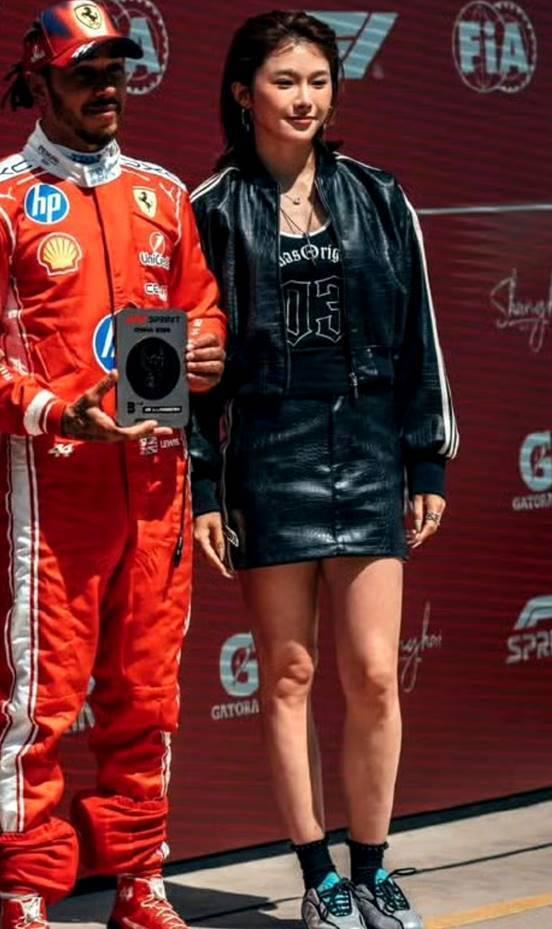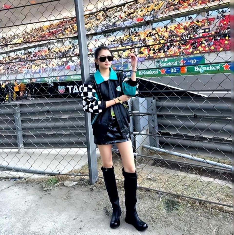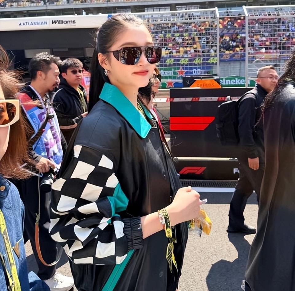 她担任的是 F1 学院赛的挥旗嘉宾,手持巨大格子旗站上赛道。