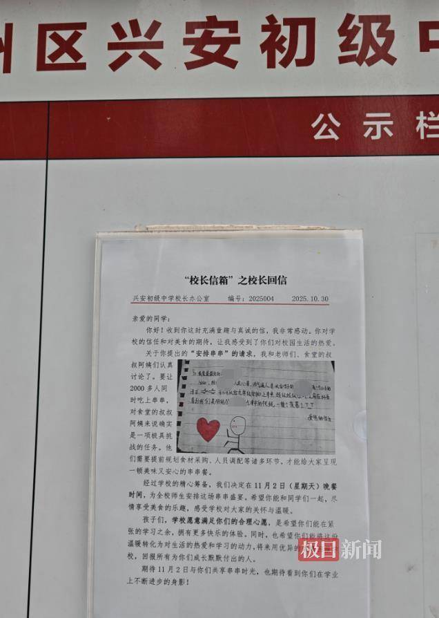 兴安中学校长办公室回复该学生,校长同学校老师、食堂工作人员商讨,要让学校2000多人一同吃上串串是一项极具挑战性的任务,需要提前规划食材采购、人员调配等,经过学校精心筹备,决定于11月2日晚餐,为全校师生安排串串盛宴。“孩子们,学校愿意满足你们的合理心愿,希望你们能在紧张学习之余,拥有更多快乐体验。”